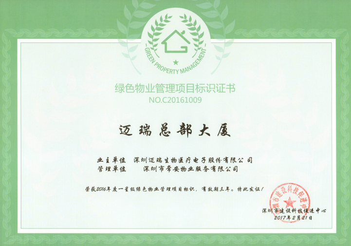 為落實(shí)深圳市住建局關(guān)于《深圳市綠色物業(yè)管理導(dǎo)則(試行)》指導(dǎo)精神,在保證物業(yè)服務(wù)質(zhì)量等基本要求的前提下,通過科學(xué)管理、技術(shù)改造和行為引導(dǎo),有效降低各類物業(yè)運(yùn)行能耗,最大限度地節(jié)約資源和保護(hù)環(huán)境,致力構(gòu)建節(jié)能低碳生活社區(qū)的物業(yè)管理活動(dòng),實(shí)現(xiàn)城市經(jīng)濟(jì)社會(huì)可持續(xù)發(fā)展目標(biāo),提高物業(yè)管理的科技含量和服務(wù)水平。2016年12月,在公司的正確領(lǐng)導(dǎo)和相關(guān)部門的積極配合下,通過項(xiàng)目全體員工的共同努力,我司“崇文花園”項(xiàng)目和“邁瑞總部大廈”項(xiàng)目順利通過了深圳市建設(shè)科技促進(jìn)中心的相關(guān)評(píng)審,分別獲得了“2016年度三星級(jí)綠色物業(yè)管理項(xiàng)目”證書和“2016年度一星級(jí)綠色物業(yè)管理項(xiàng)目”證書。