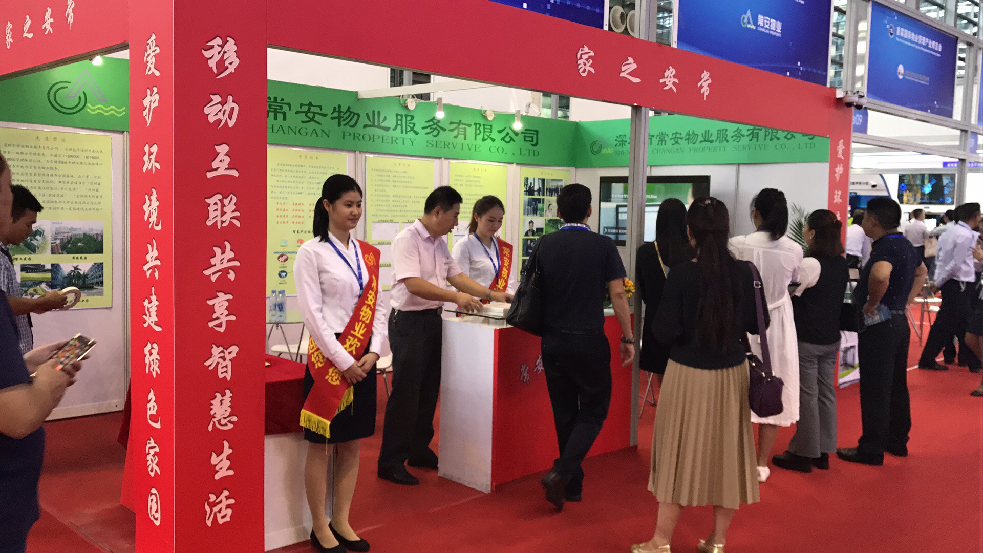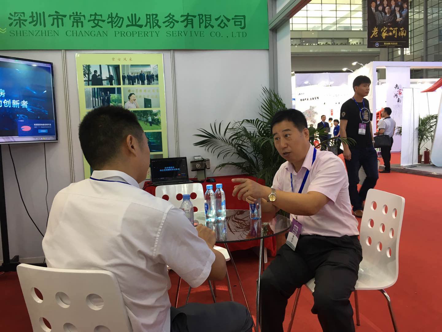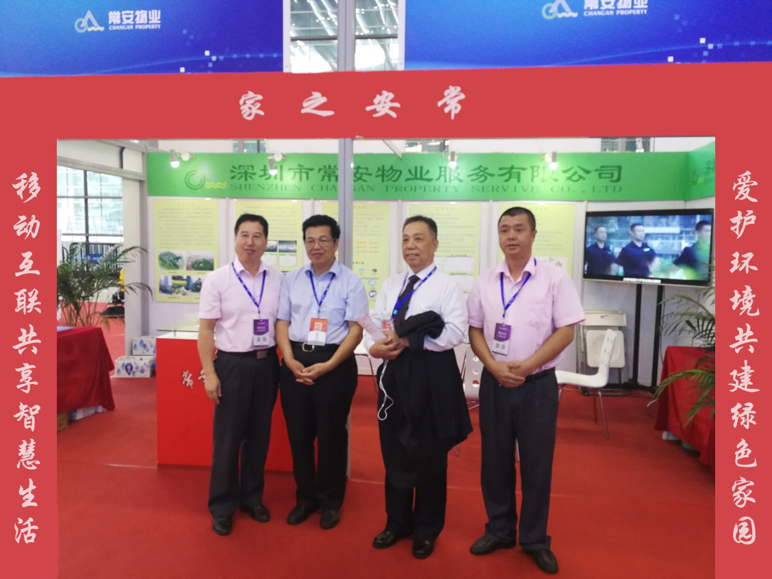 中國物業(yè)管理協(xié)會(huì)會(huì)長沈建忠及深圳市物業(yè)管理協(xié)會(huì)會(huì)長曹陽在常安物業(yè)公司展位前合影留戀