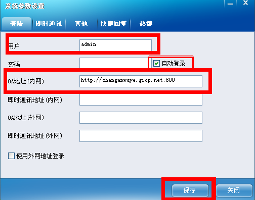 (4)OA地址(內(nèi)網(wǎng))修改成下面內(nèi)容[changanwuye.gicp.net:800]。用戶名首次登陸為自己的名字,沒有密碼。點(diǎn)擊保存。就可以直接登錄了。