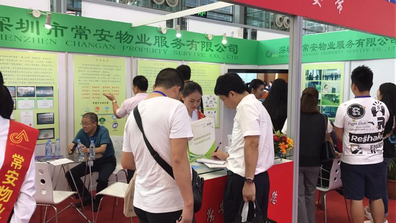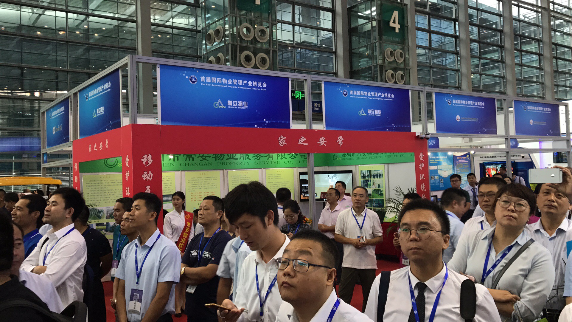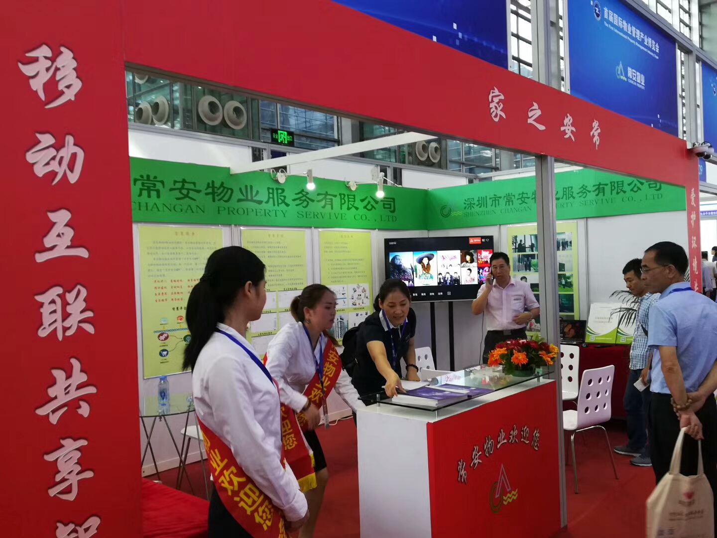 中國物業(yè)管理協(xié)會(huì)會(huì)長沈建忠及深圳市物業(yè)管理協(xié)會(huì)會(huì)長曹陽在常安物業(yè)公司展位前合影留戀