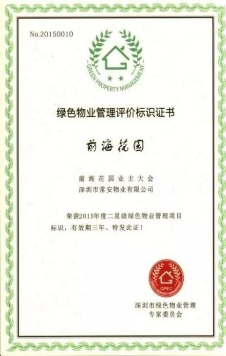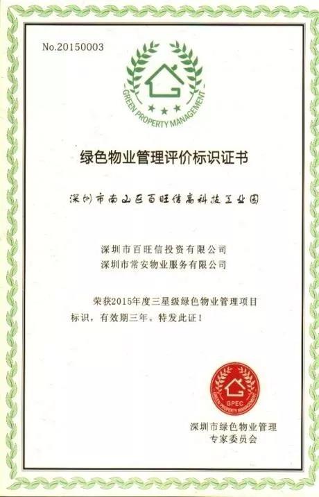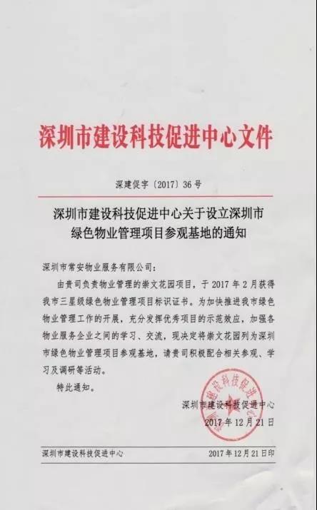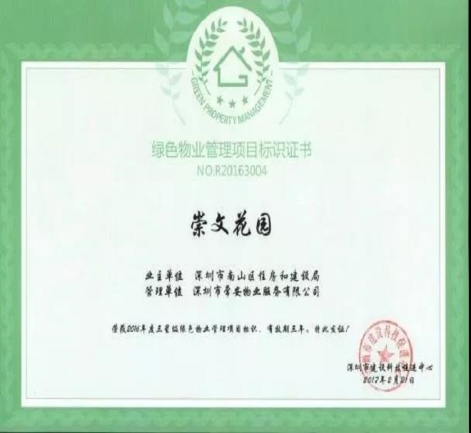 依據(jù)2011 年深圳出臺的首部《深圳市綠色物業(yè)管理導(dǎo)則(試行)》和 2013 年出臺的《深圳市綠色物業(yè)管理項目評價辦法和細則(試行)》,常安物業(yè)積極響應(yīng)并開展綠色物業(yè)管理工作,2016 年至今,共有四個項目榮獲了深圳市政府部門頒發(fā)的綠色物業(yè)管理項目證書,其中崇文花園還被深圳市政府部門列為深圳市綠色物業(yè)管理項目參觀基地,2019年出任廣東省綠色供應(yīng)鏈協(xié)會綠色物業(yè)管理專業(yè)委員會副主任委員單位。色物業(yè)管理